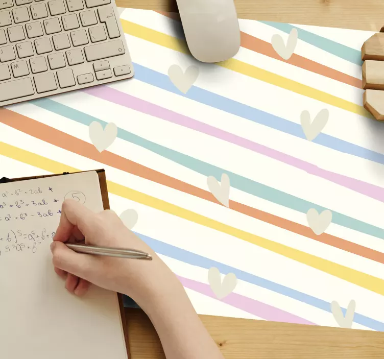 Värikkäät sydänraidat kuviollinen hiirimatto kuvio hiirimatto on täydellinen valinta työpisteen koristeluun. Sen ainutlaatuinen design luo iloisen ja energisen työympäristön, joka voi parantaa keskittymiskykyä ja luovuutta. Tämä hiirimatto ei ole vain käytännöllinen, vaan myös esteettinen lisä, joka tuo väriä ja eloa mihin tahansa tilaan. Sen sydämet ja raidat tuovat leikkisyyttä ja iloa, mikä tekee siitä upean lahjan ystävälle tai itselle! Inspiroidu ja nauti työskentelystäsi värikkään sydänraidat hiirimaton avulla!
