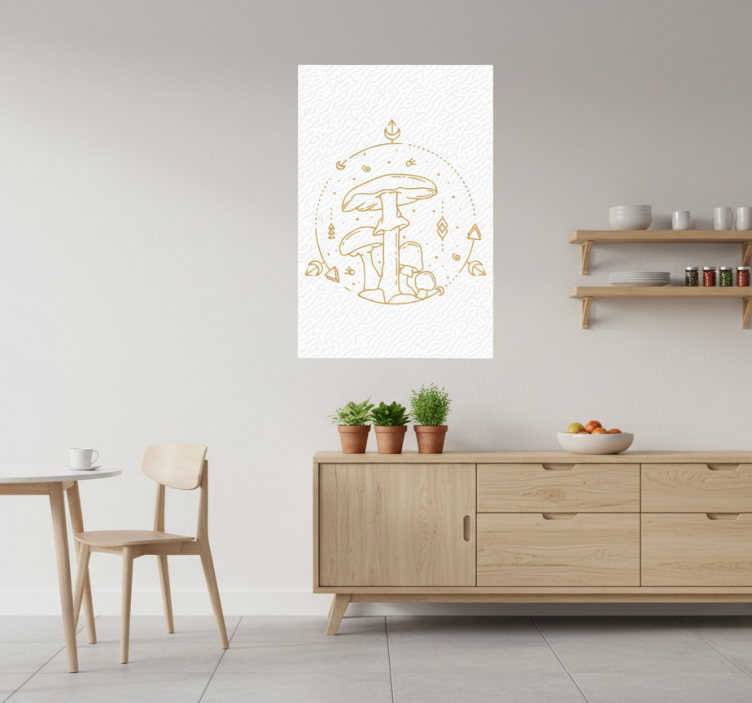 Geometrinen sieni yksiviivainen muotoilu keittiöjuliste on loistava valinta, jos haluat tuoda keittiöösi modernia ilmettä! Sen yksinkertainen mutta vaikuttava design toimii upeana keskustelunavauksena, ja se tuo valoa ja energiaa tilaan. Tämä keittiöjuliste inspiroi luovuutta ja tekee keittiöstäsi kodikkaamman ja tyylikkäämmän paikan, jossa on ilo viettää aikaa. Koristele seinät tällä kauniilla teoksella ja anna sen viehättää vieraitasi!