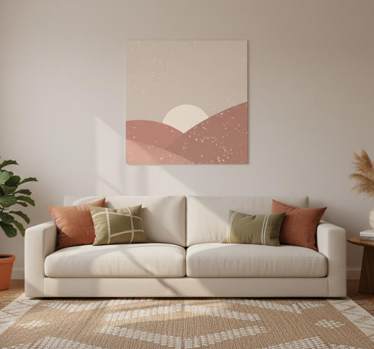 Viite: G870Tyylikäs olohuone sisältää minimalistisen sohvan, joka on koristeltu maanläheisillä tyynyillä, ja sen lisänä on mukava matto. Taustalla rauhoittava taideteos esittää kumpuilevia kukkuloita pehmeän auringon alla, tarjoten rauhoittavaa tunnelmaa. Runsas vihreys ruukussa lisää elinvoimaa, luoden kutsuvan ja rentouttavan tilan.