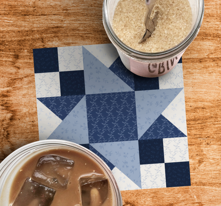 Monimutkainen tähtikuvio esittelee yksityiskohtaisia kukkaelementtejä eri sinisen sävyissä. Tämä malli yhdistää geometrisia elementtejä herkän estetiikan kanssa, luoden viehättävän visuaalisen ilmeen, joka sopii monenlaisiin ympäristöihin.