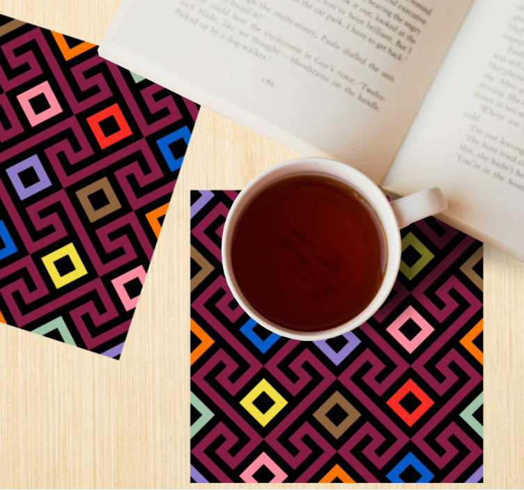Värikäs geometrinen kuosi lasinalunen on moderni ja abstrakti taideteos, joka tuo eloa ja energiaa mihin tahansa tilaan! Tämä geometrinen design yhdistää värikkäät sävyt ja labyrinttimaisen kuvion, joka vangitsee katseet. Lasinalunen ei ainoastaan suojaa pintoja, vaan toimii myös keskustelunavauksena ystävien ja perheen kesken!