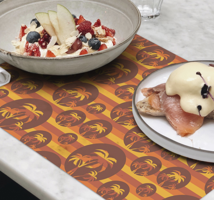 Alkuperäinen pöytätabletti trooppiset palmukuviot on suunniteltu tuomaan kesäisiä fiiliksiä kotiisi. Sen raidat, kämmenet, ja puut luovat yhdessä upean trooppisen tunnelman. Oranssit värit ja ympyrät yhdistyvät harmoniseksi kokonaisuudeksi, joka tuo mieleen auringonpaisteen ja lämpimät kesäpäivät!