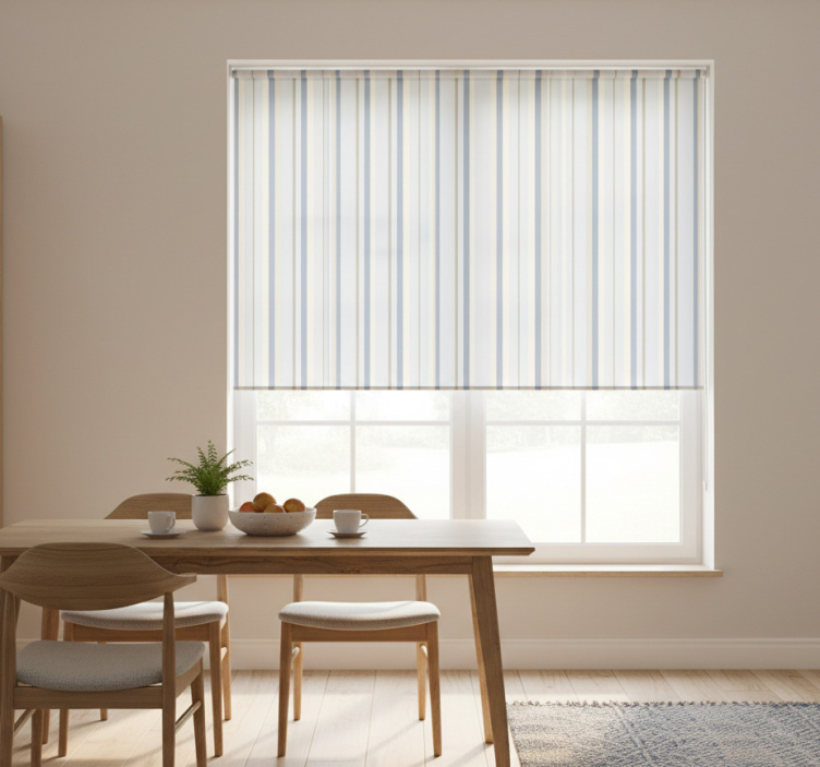 80-luvun sinivalkoraidallinen ruokasalin rullaverho