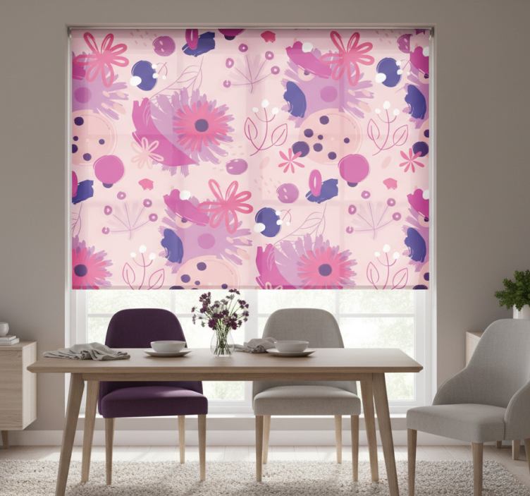Abstraktit violetit kukat ruokasalin rullaverho on loistava valinta, kun haluat lisätä persoonallisuutta ja tyyliä ruokasaliisi. Tämä ruokasalin rullaverho ei ainoastaan suojaa huonetta suoralta auringonvalolta, vaan se myös parantaa sisustusta omaperäisellä tavalla. Se tarjoaa yksityisyyttä ja auttaa säätelemään huoneen lämpötilaa, mikä tekee siitä käytännöllisen valinnan. Kun rullaverho lasketaan, se luo rauhallisen ja esteettisen ympäristön, jossa on mukavaa nauttia aterioista perheen ja ystävien kanssa!