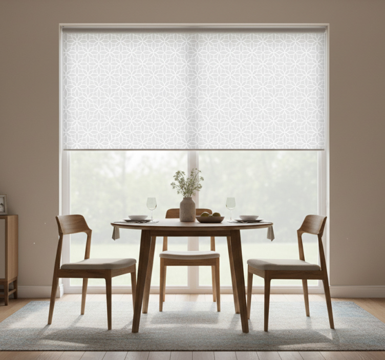 Harmaa ja valkoinen moderni kuvio ruokasalin rullaverho