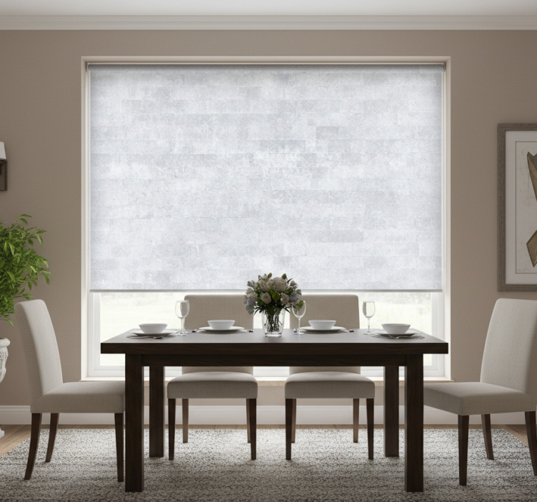 Harmaan tiilikuosiset kuluneet rullaverhot ruokasaliin