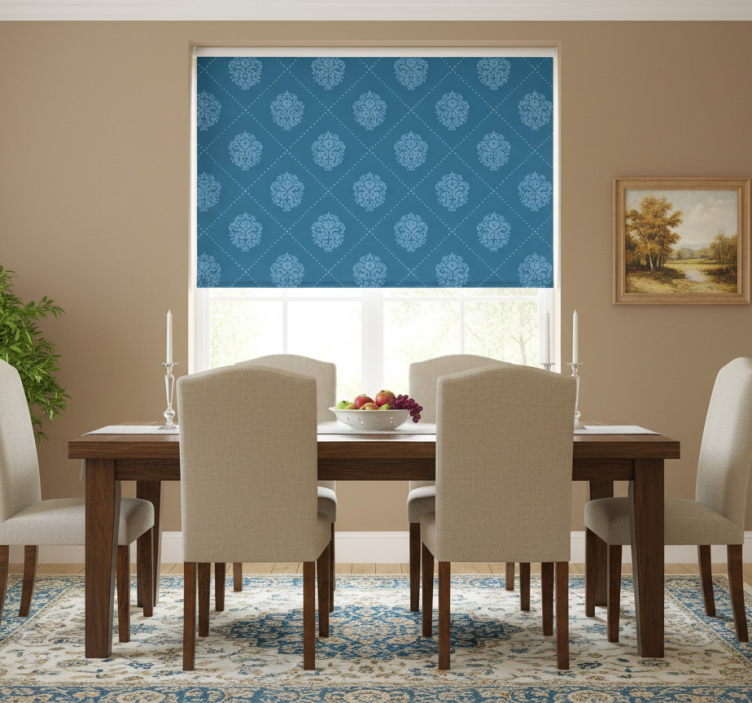 Kukkakuvioinen timanttirullaverho ruokasaliin