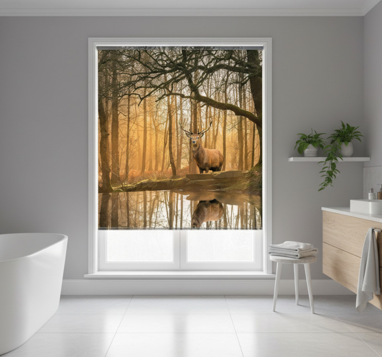 Kultainen hirvi järvellä puukuviollinen rullaverho
