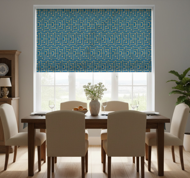 Kultaiset viivat sinisellä taustalla ruokasalin rullaverho