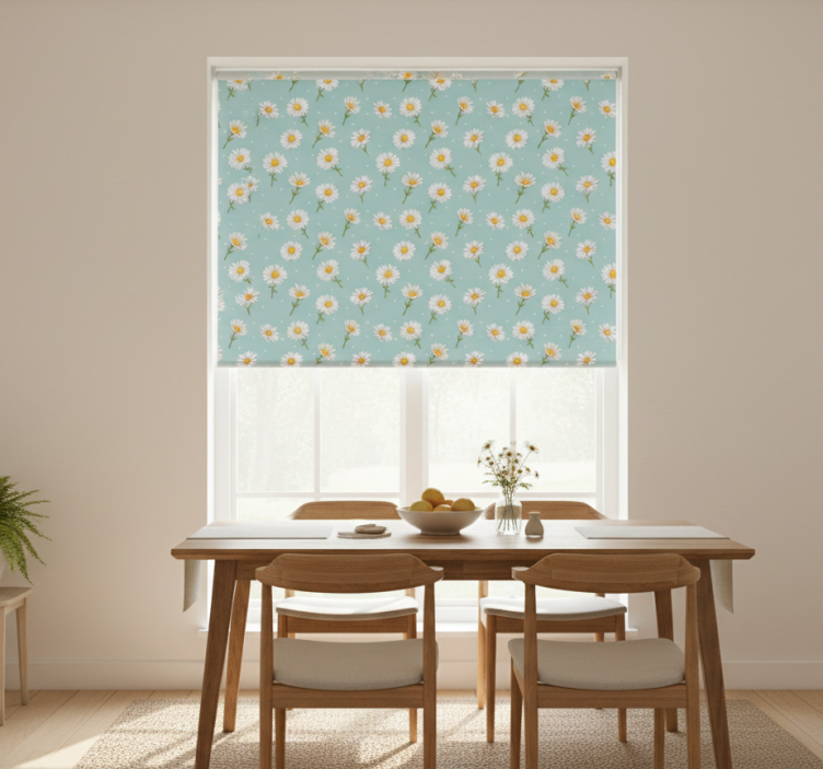 Kumarretut päivänkakkarat ruokasalin rullaverho