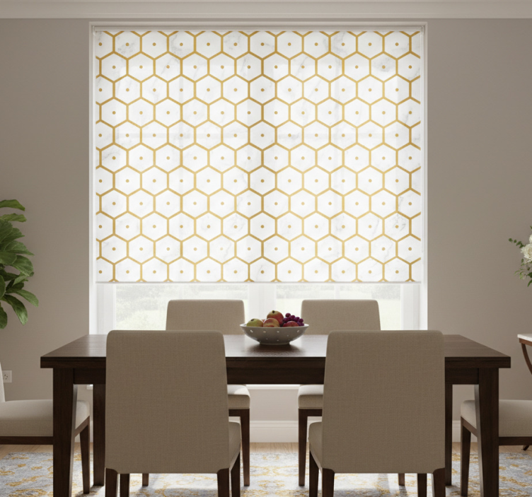 Kuusikulmainen kultamarmorikuosiset rullaverhot ruokasaliin