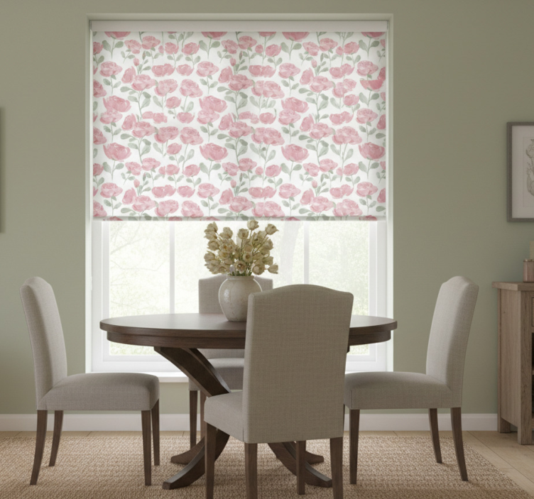 Luonnollinen vintage-ruusukuosi ruokasalin rullaverho