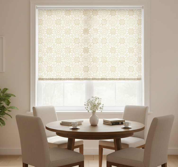 Moderni valkoinen kukkakuviollinen ruokasalin rullaverho