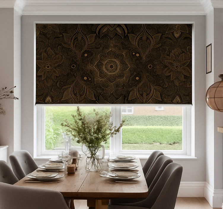 Upea musta ja kultainen mandala ruokasalin rullaverho tuo kotiisi ainutlaatuista tyyliä ja eleganssia! Sen graafinen suunnittelu yhdistää harmonisesti mustan ja kultaisen värimaailman, luoden vaikutelman, joka vangitsee katseet. Tämä rullaverho ei ainoastaan suojaa huonetta suoralta auringonvalolta, vaan myös parantaa sisustusta merkittävästi. Sen kauniit mandalakuviot tuovat rauhoittavan tunnelman ruokasaliin ja tekevät siitä entistä kutsuvamman. Samalla se tarjoaa yksityisyyttä, jotta voit nauttia ruokailuhetkistä ilman häiriöitä!