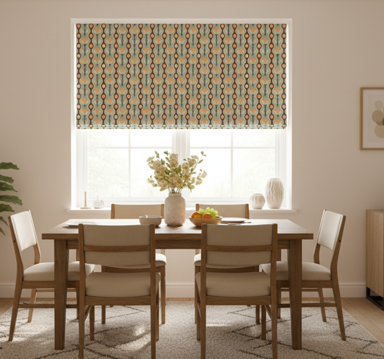 Oranssi epäsäännöllinen kukkakuosi ruokasalin rullaverho tuo tilaan raikkautta ja iloa! Tämä ruokasalin rullaverho ei ainoastaan paranna huoneen sisustusta, vaan se myös luo miellyttävän tunnelman ruokailuhetkiin. Sen värikäs ja ainutlaatuinen muotoilu tekee siitä erottuvan yksityiskohdan, joka vangitsee vieraiden katseet. Rullaverho mahdollistaa huoneen lämpötilan säätelyn ja antaa turvaa, sillä voit nähdä ulos, mutta ulkopuolella olevat eivät näe sisälle. Tämä on täydellinen valinta, jos arvostat kauniita ja käytännöllisiä ratkaisuja!