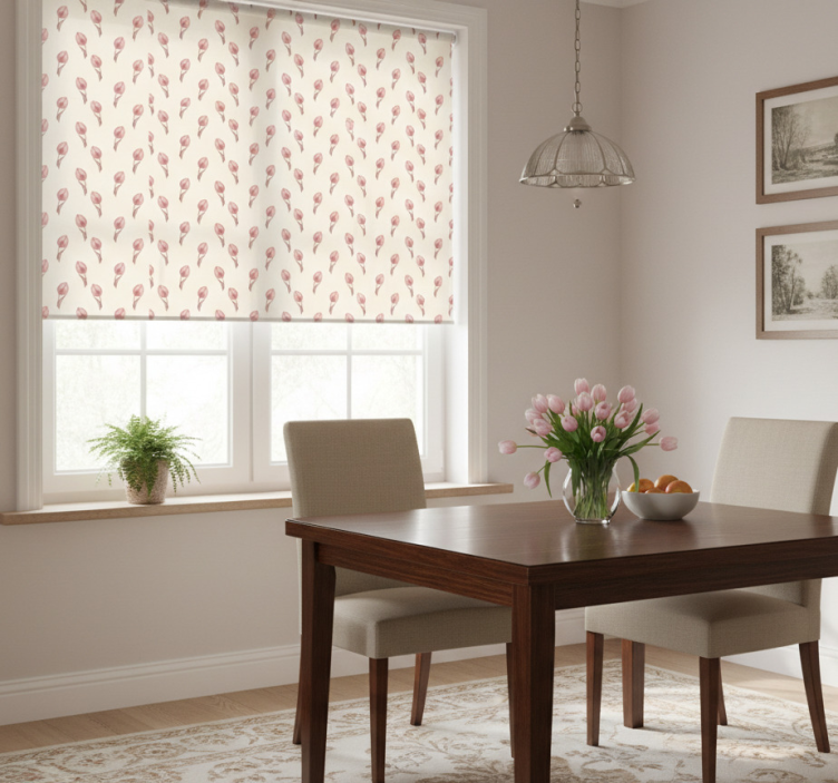 Pienet vaaleanpunaiset tulppaanit ruokasalin rullaverho