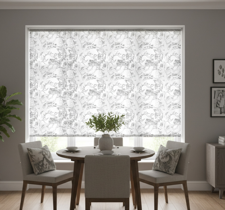 Pimeät puunoksat ruokasalin rullaverho