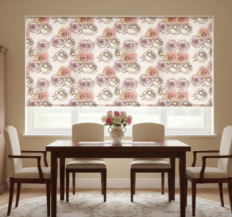 Ruokasalin rullaverho englantilaistyylisillä ruusuilla