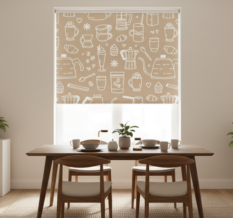 Ruokasalin rullaverho kahvikuppi- ja lasikuvioilla