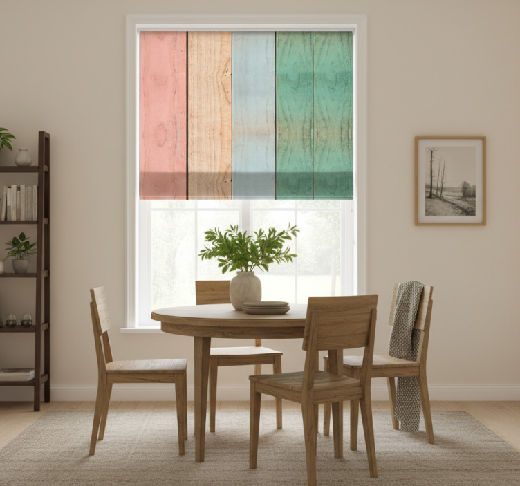 Ruokasalin rullaverho puuefektillä värikkäillä laudoilla