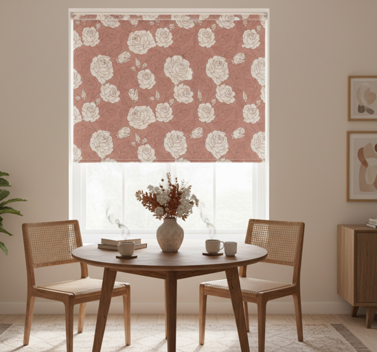 Ruokasalin rullaverho terrakotta suurilla ruusuilla