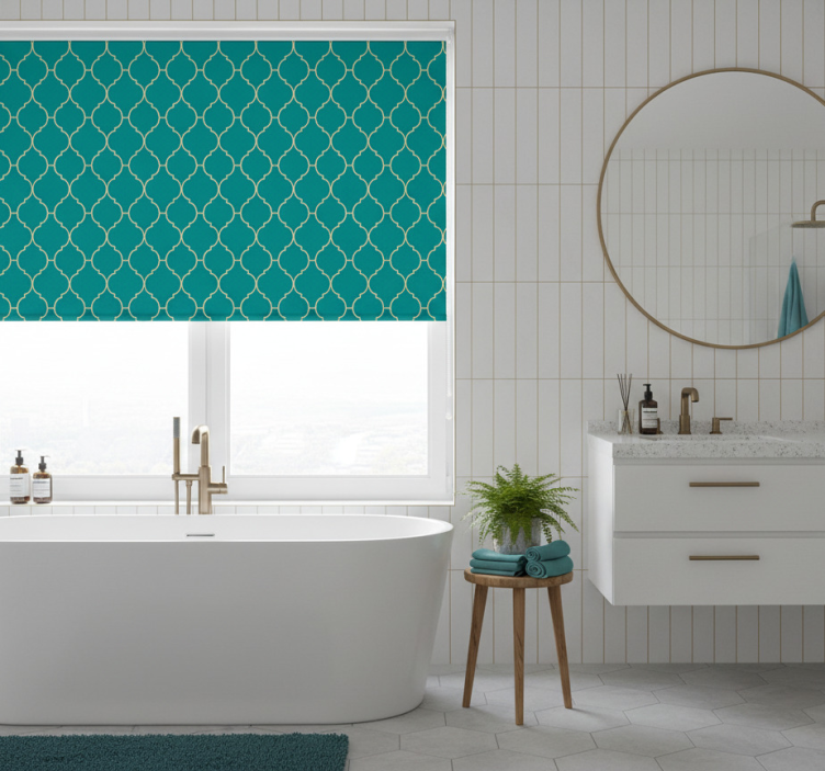 Sininen rullaverho kultainen ja turkoosi kuosi