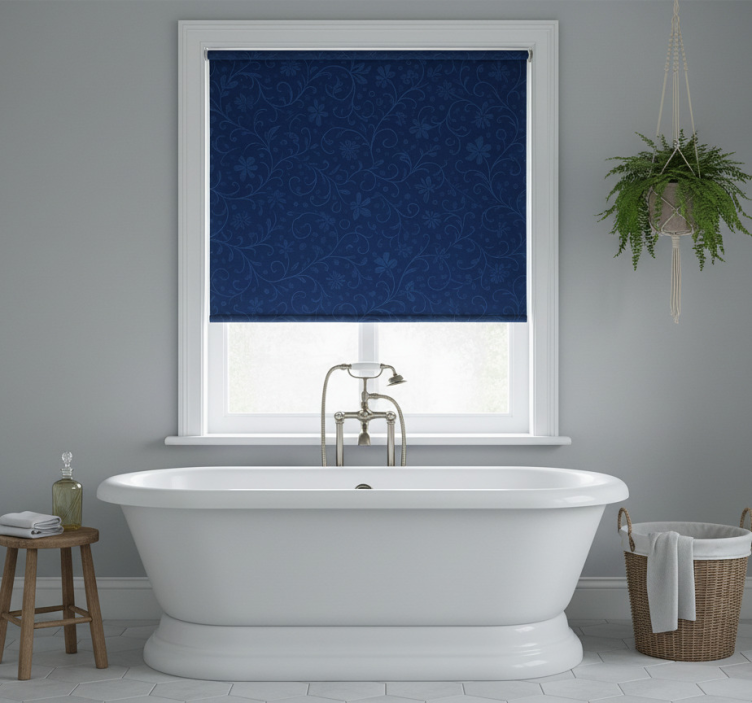 Sininen rullaverho laivastonsinisin kukkakuvioin