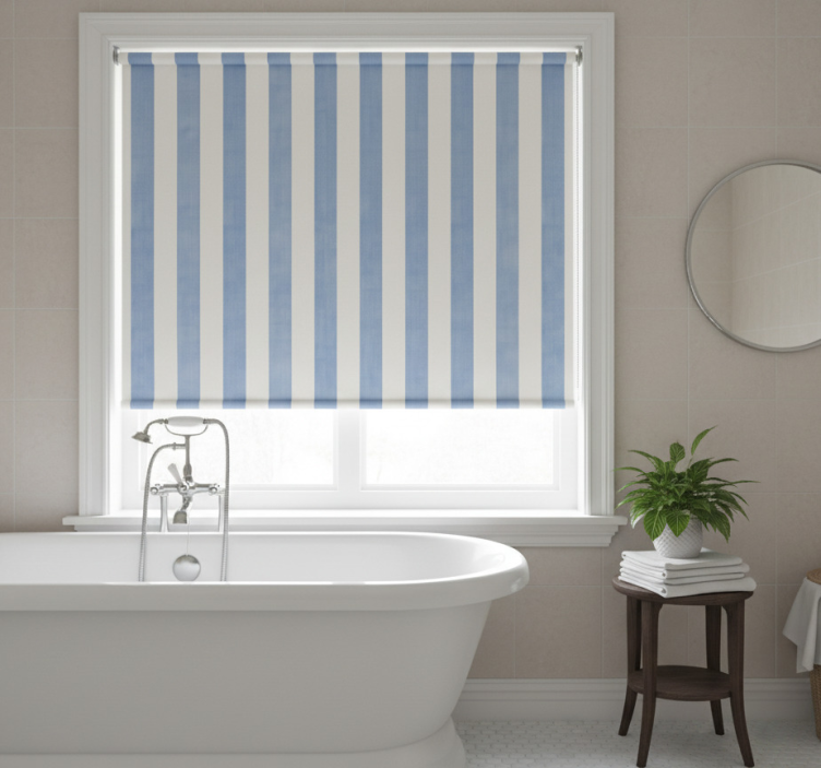 Sininen rullaverho sinivalkoisilla raidoilla