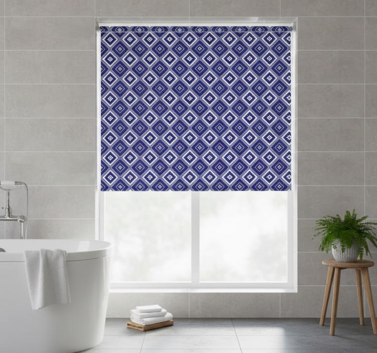 Sininen rullaverho timanttikuvioilla