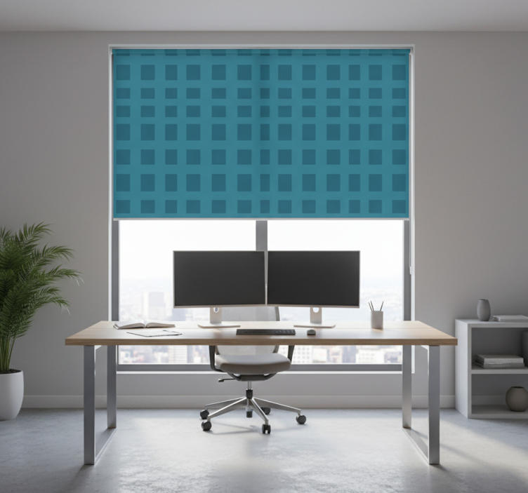 Sinisen ruutukuosiset rullaverhot toimistoon