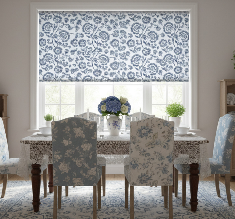 Siniset kukat grandmillenial-kuvio ruokasalin rullaverho