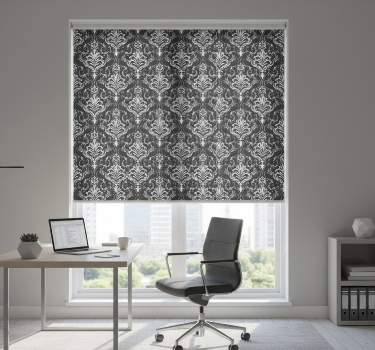 Toimiston rullaverho barokkityylisellä kasvi-aiheella
