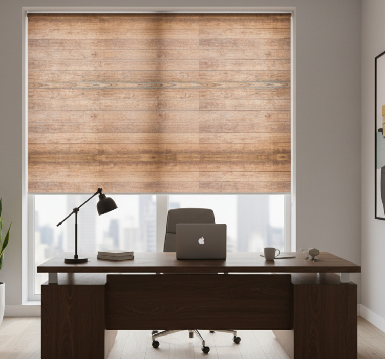Toimiston rullaverho vaakasuorista puupaneeleista