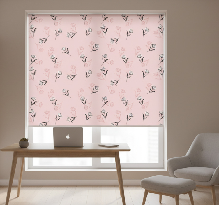 Toimiston rullaverho valkoiset liljat vaaleanpunaisella taustalla