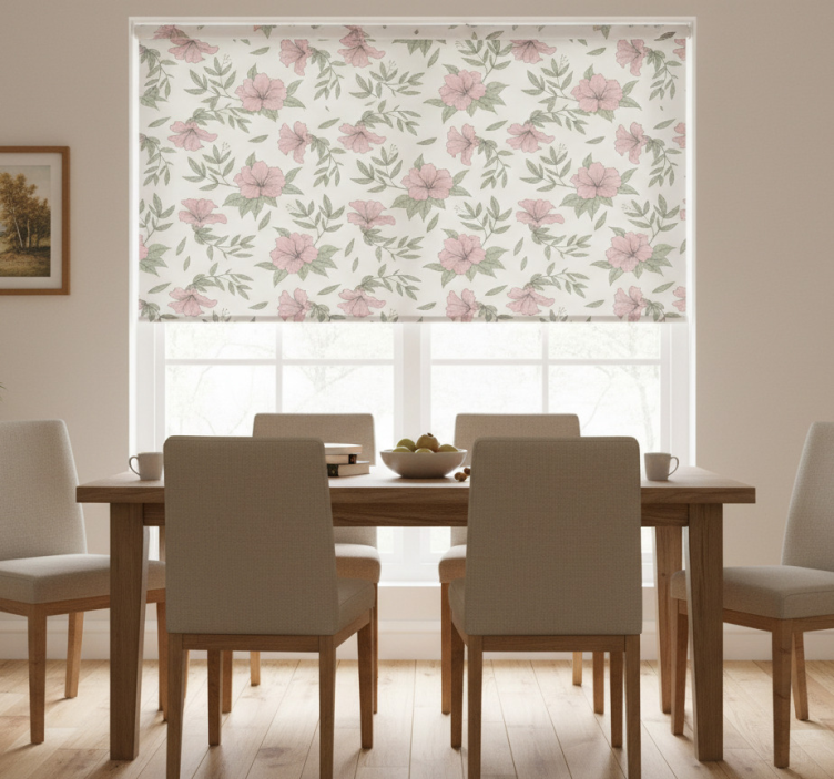 Vaaleanpunainen kukkakuviollinen ruokasalin rullaverho
