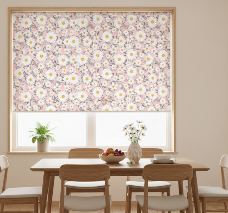 Vaaleanpunaiset päivänkakkarakuviot ruokasalin rullaverho