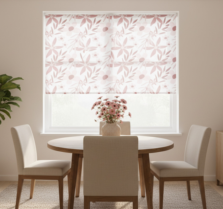 Vaaleanpunaiset päivänkakkarat ruokasalin rullaverho