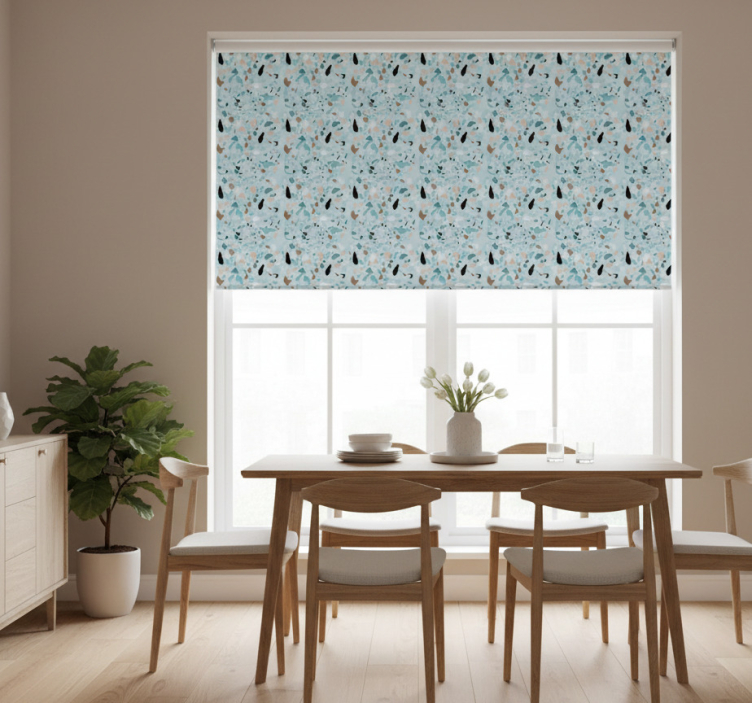 Vaaleansininen terrazzoefekti ruokasalin rullaverho