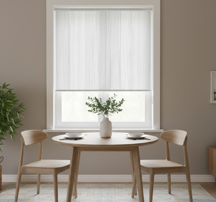 Valkoinen puutyylinen ruokasalin rullaverho