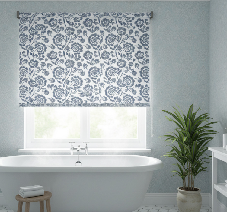 Siniset kukat valkoisella taustalla kylpyhuoneen rullaverho on loistava tapa elävöittää tilaa ja tuoda siihen persoonallisuutta. Tämä kylpyhuoneen rullaverho ei ainoastaan suojaa huonetta suoralta auringonvalolta, vaan se myös parantaa huoneen sisustusta! Inspiroiva kukkakuosi luo rauhoittavan tunnelman, joka tekee kylpyhuoneestasi miellyttävän paikan rentoutumiseen. Sen avulla voit säätää huoneen lämpötilaa ja nauttia yksityisyydestä, kun lasket verhon alas. Tee kylpyhuoneestasi oma rauhoittava keitaasi!