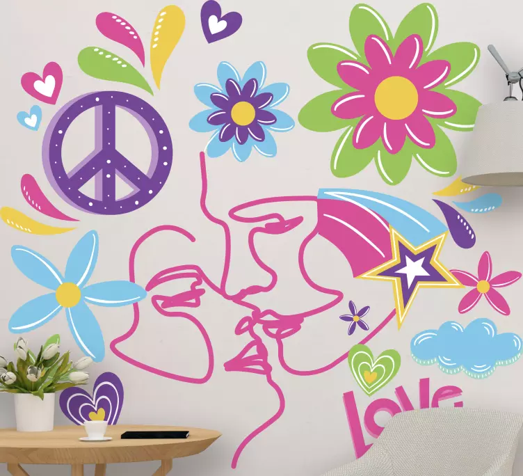Suunnittelu kuvaa naista ja miestä romanttisessa läheisyydessä, ja se on esillä yhdessä muiden koristekuvioiden kanssa. Tämä tekee tarrasta upean sisustuksen tilaan.
