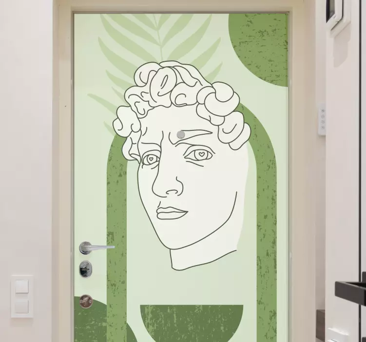 Aikamme kasvotaideovitarra on upea tapa tuoda taidetta kotiisi! Sen graafinen suunnittelu yhdistää minimalistisen lähestymistavan ja modernin muotoilun, jossa näkyy ikoninen Daavid-patsas viivapiirrosmuodossa. Vihreät sävyt ja abstraktit muodot luovat rauhoittavan tunnelman, joka tekee ovistasi todellisen katseenvangitsijan.