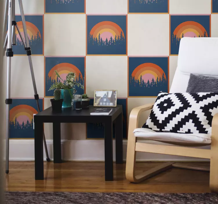 Esittelyssä Auringonlasku metsämaisema sijaintitarra, joka vie sinut luonnon kauneuden äärelle! Tämä graafisesti upea suunnittelu yhdistää auringon ja metsän lumoavan tunnelman. Tyylikkäät laatot ja värit luovat rauhoittavan maiseman, joka vie ajatukset auringonlaskun hetkiin. Luonto herää eloon tällä kauniilla tarralla, joka tuo kotiisi ripauksen rauhaa ja kauneutta!