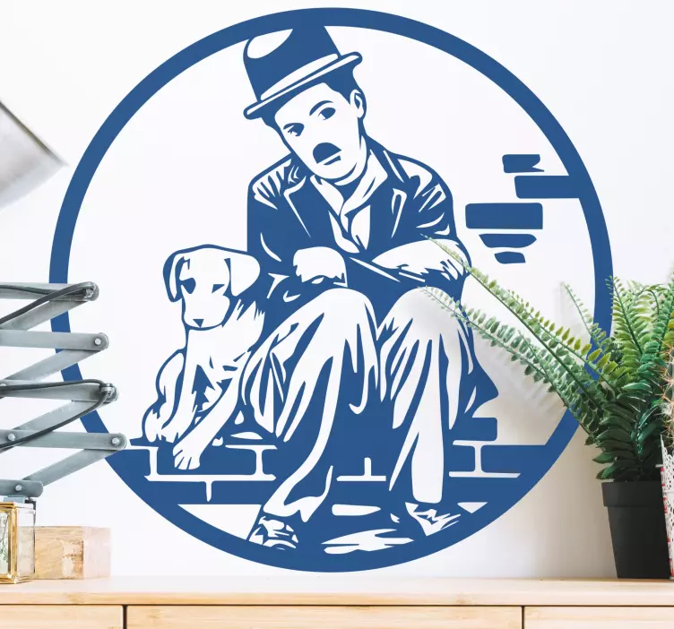 Tämä upea siluetti vinyyli tarra kuvaa Charlie Chaplinia, legendaarista näyttelijää, joka istuu koiransa kanssa rappukotelossa. Tarra esitetään pyöreällä taustalla, mikä antaa sille modernin ja tyylikkään ilmeen.