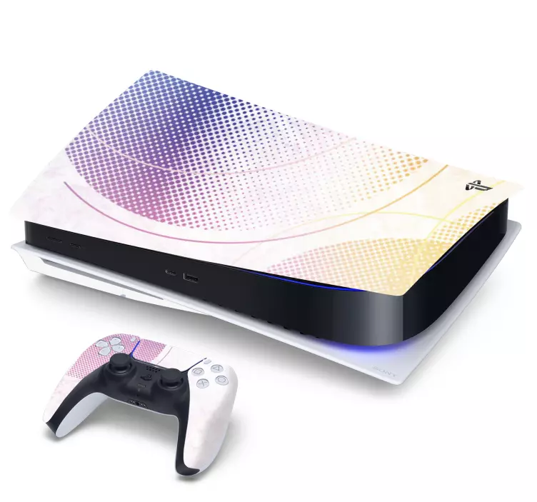 Viite: A47621Vibrantti muotoilu, jossa on geometrisia kuvioita vaaleanpunaisissa, violeteissa ja keltaisissa sävyissä, täydentää pelikonsolia ja ohjainta. Elementit sulautuvat saumattomasti yhteen tarjoten tyylikkään ja ainutlaatuisen ilmeen, joka on suunniteltu peliharrastajille.