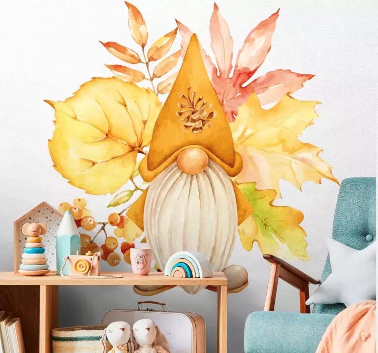 Viite: A51711Sateenkaarimainen syksy-teemainen muotoilu, jossa on leikkisä gnome, ympäröitynä eloisilla lehdillä. Gnome ilmentää kauden iloa, tuoden lämpöä ja kodikasta tunnelmaa mihin tahansa tilaan, mikä tekee siitä täydellisen juhlallisiin kokoontumisiin tai yksinkertaiseen kodin sisustukseen. Sen leikkisä ilme parantaa kutsuvaa ilmapiiriä.