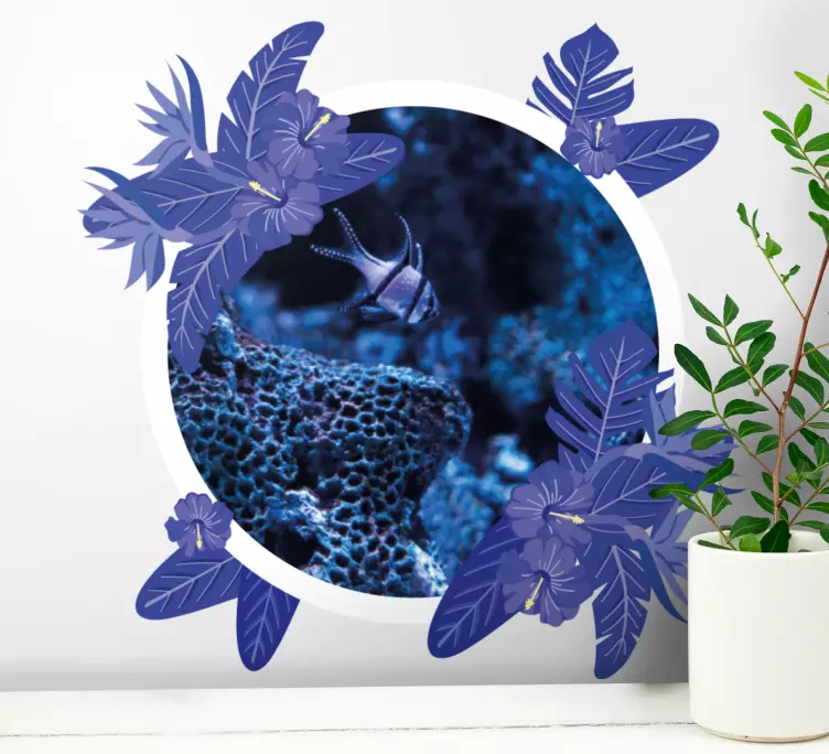 Viite: A48297Syvälle immersiiviseen vedenalaiseen kohtaukseen, jossa elävät korallit ja kala uiskentelee rakenteiden joukossa. Kohtauksen ympärillä on reheviä trooppisia lehtiä, jotka lisäävät syvyyden ja elämän tuntua. Tämä luonnollinen ympäristö herättää tunteita rauhallisuudesta ja tutkimusmatkasta.