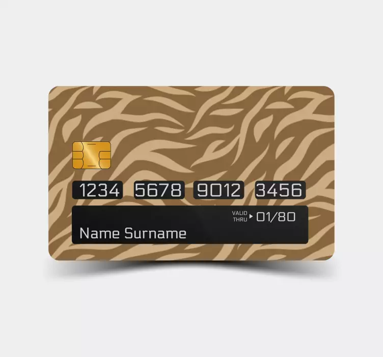 Dinosaurus tarra villikuvio kortti on upea ja näyttävä lisävaruste, joka tuo persoonallisuutta luottokorttiisi. Sen graafinen suunnittelu yhdistää eläinprintti -teeman, jossa näkyvät tiikerin ja seepra -kuvioita ruskealla taustalla. Tämä abstrakti tarradesign on inspiroitu luonnosta ja eläimistä, mikä tekee siitä täydellisen valinnan kaikille, jotka rakastavat eksoottisia kuvastoja.