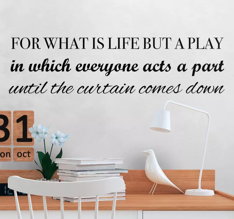 Viite: A49740Ajatuksia herättävä lause heijastaa käsitystä siitä, että elämä on kuin teatteriesitys, jossa jokaisella yksilöllä on merkittävä rooli loppuun asti. Tämä viesti kannustaa arvostamaan elämän ohimenevää luonteenpiirrettä ja jokaisen toiminnan tärkeyttä.
