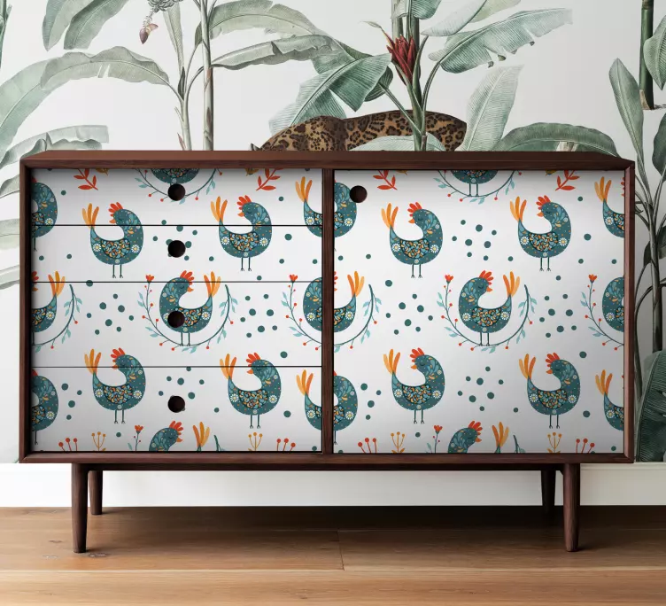 Elävä kukko kuva huonekalutarra tuo kotiisi leikkisän ja värikkään tunnelman! Tässä graafisesti suunnitellussa tarrassa yhdistyvät kauniit kanat, eläimet ja kukkakuviot, jotka tekevät siitä täydellisen lisän mihin tahansa huonekaluihin. Värikäs muotoilu tuo iloa ja eloa tilaan, ja sen leikkisä kuvio herättää varmasti huomiota. Tämä tuote on kuin taideteos, joka koristaa seinäsi tai huonekalusi!